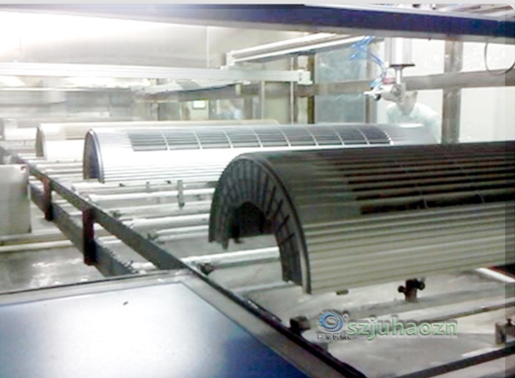 空调外壳自动喷涂流水线应用领域:手机、家电、DVD外壳、数码相机外壳、MP3/4外壳、游戏机外壳、电脑键盘、摇控器外壳、化妆品等喷漆表面处理